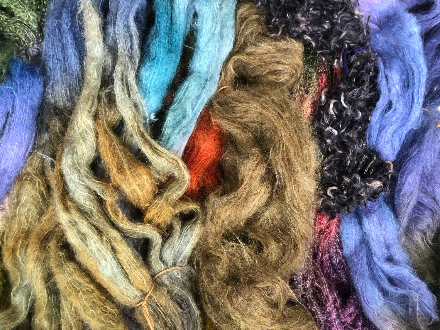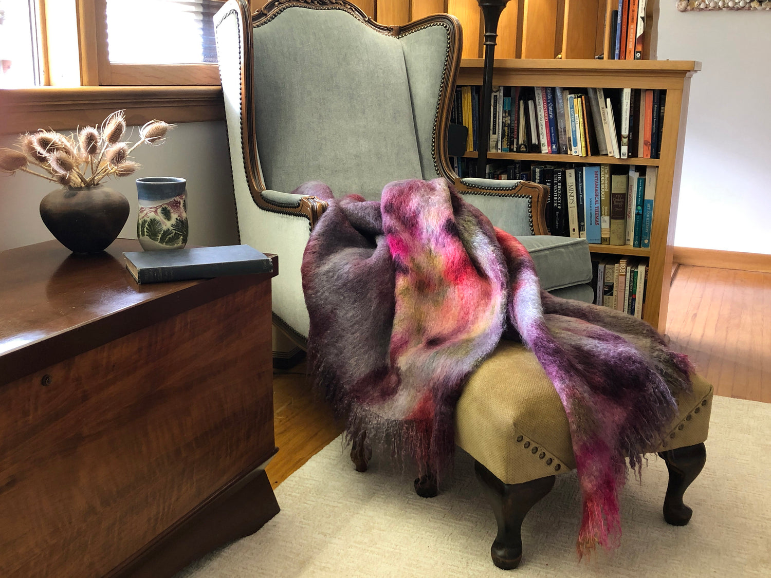 Simple sticks and threads engage generating woven cloth to be cut apart, dyed, fulled, brushed and glazed into exquisitely finished brushed kid mohair throws and accessories.