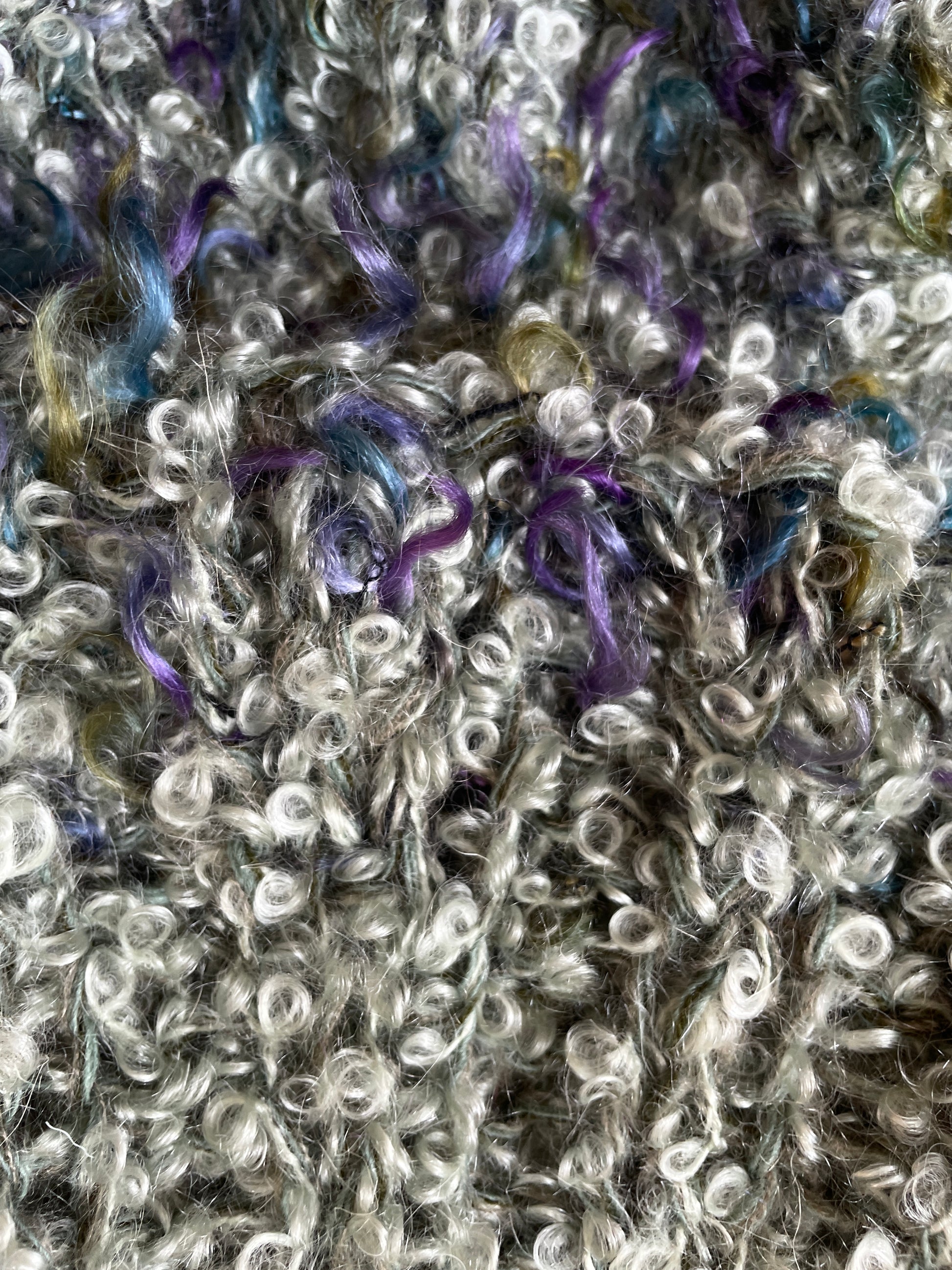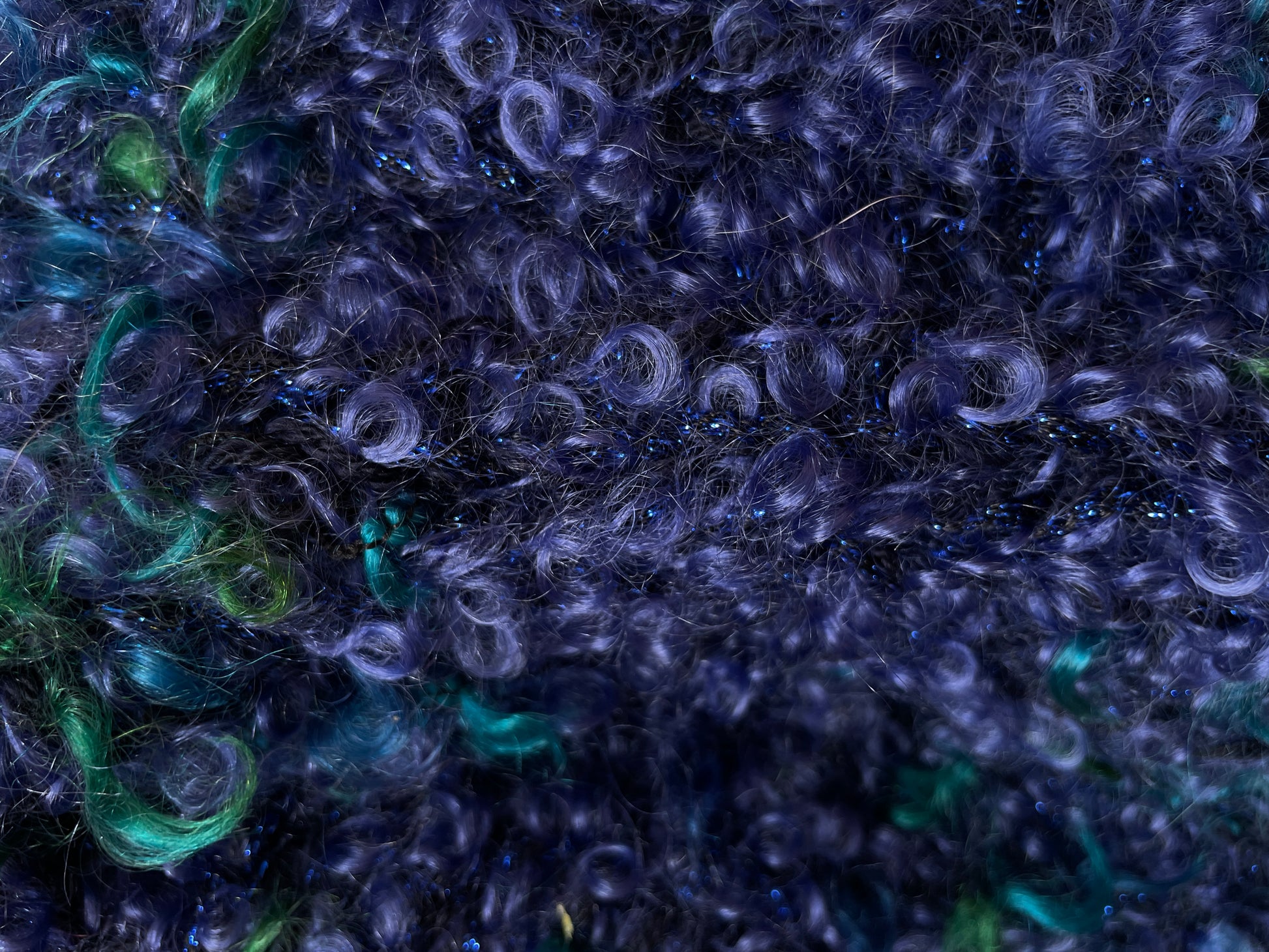 This is a sumptuous multi strand hand knit from fine luxury fibres, primarily kid mohair for soft warmth, and a wool nylon structural yarn for elastic resilience. It can be worn over a coat, bulked up high and warm over the collar, pulled up for a hood or pulled down and more open in front as a neckpiece. The blend of fibres and yarns is designed to hold and return to shape as you choose. The nature of the fibres is to resist oil and soils, but to wash simply soak swish in a mild shampoo rinse, press in a towel and lay flat to dry.