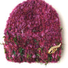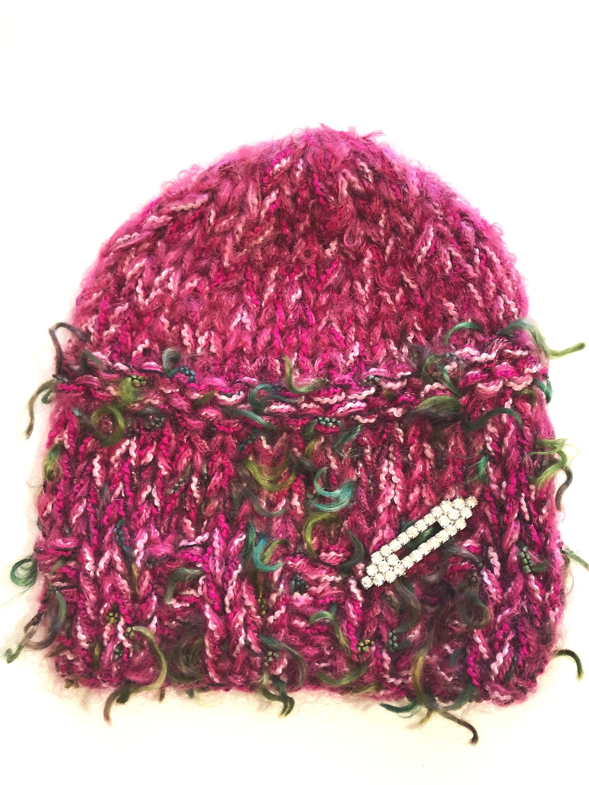 Warm and light, this long version of our all Canadian multi strand cap hand is knit from a mix of soft luxury fibres, primarily kid mohair and wool with some polyamide. Wash/soak in a mild shampoo rinse, press in a towel and lay flat to dry. Vintage pin may vary. Approximately 21-23 cm length.