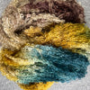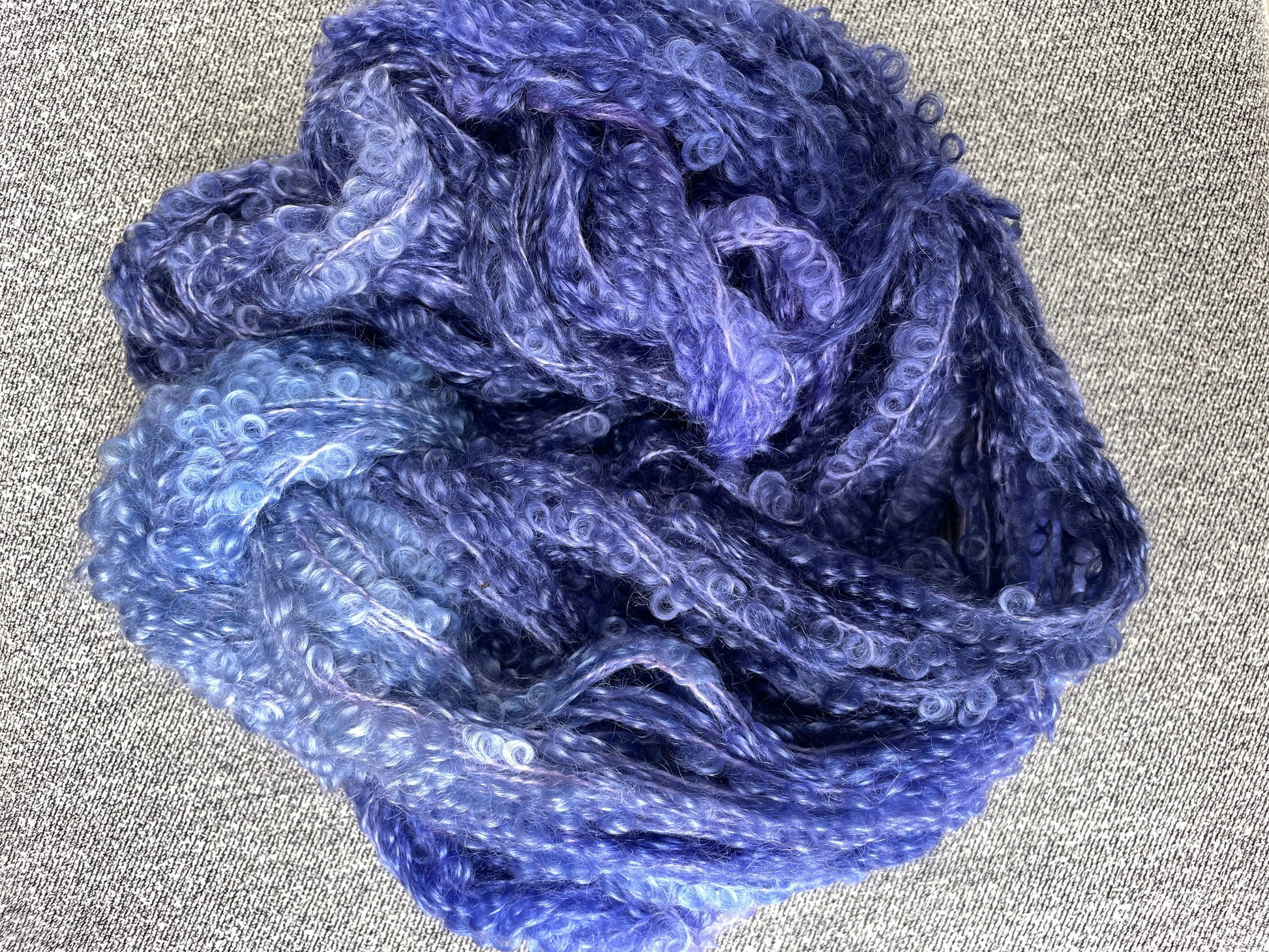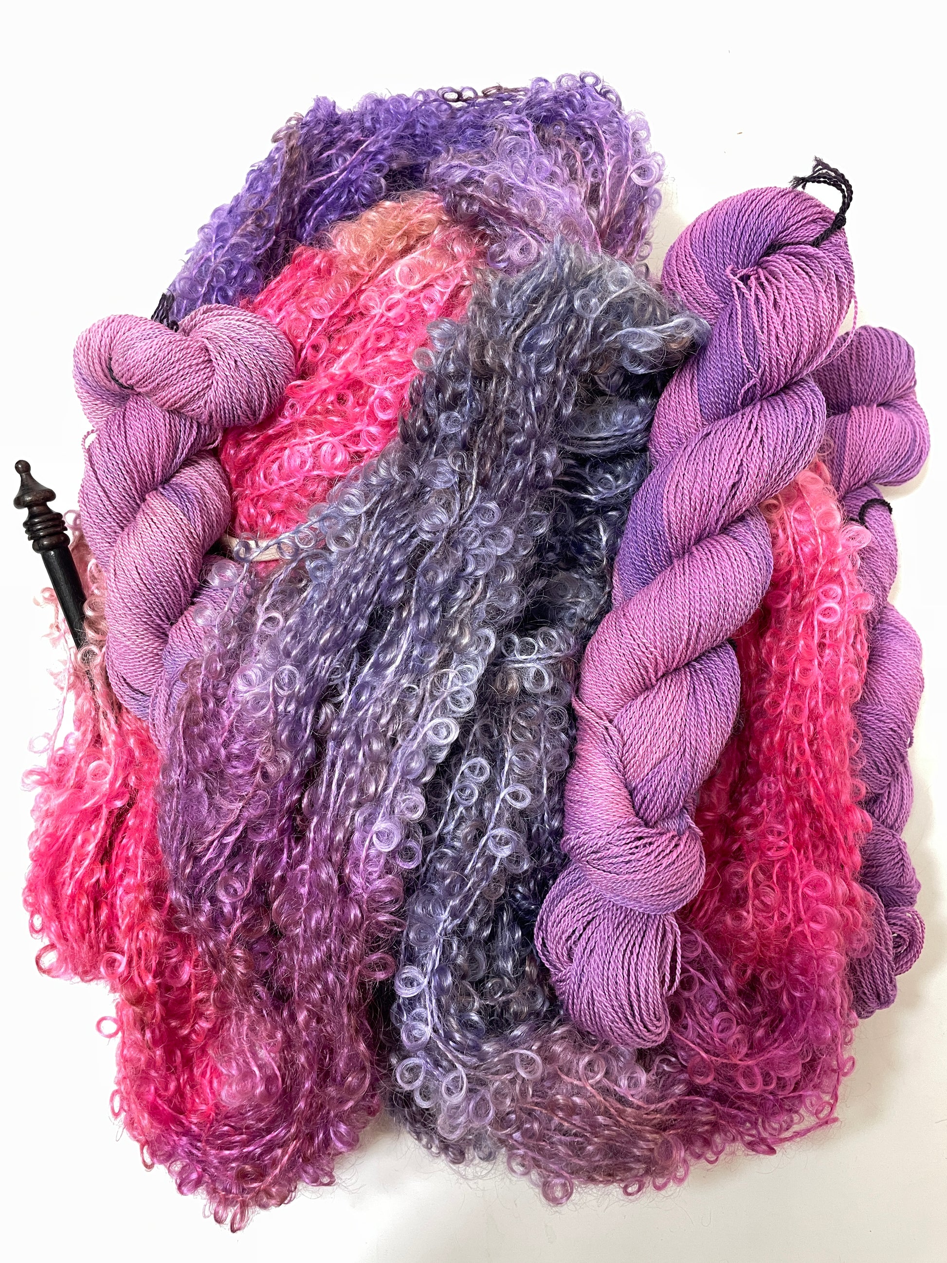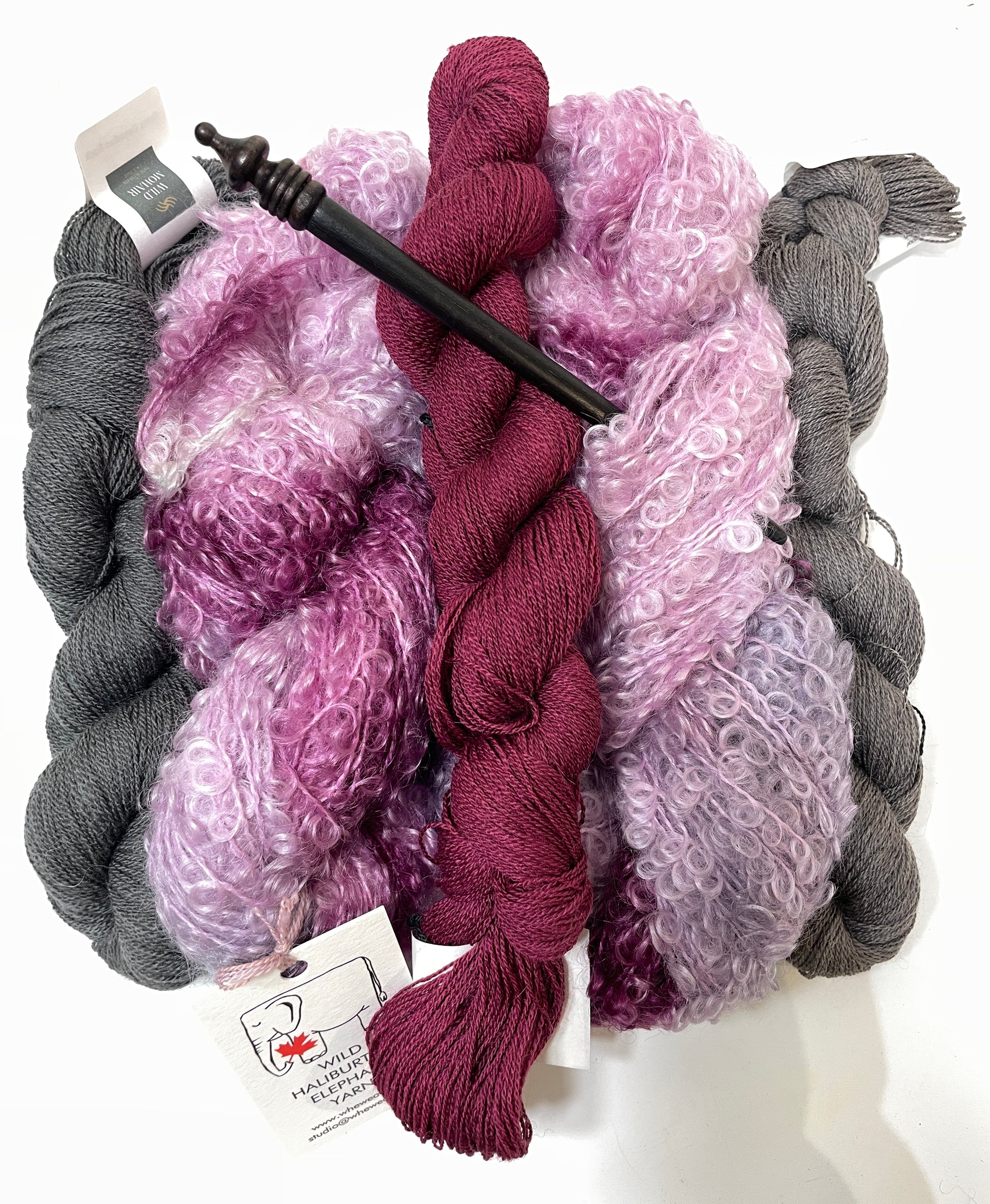This knitting kit includes boucle kid mohair skeins and complementary Canadian Sock yarn colours as well as the pattern and hardwood pin.