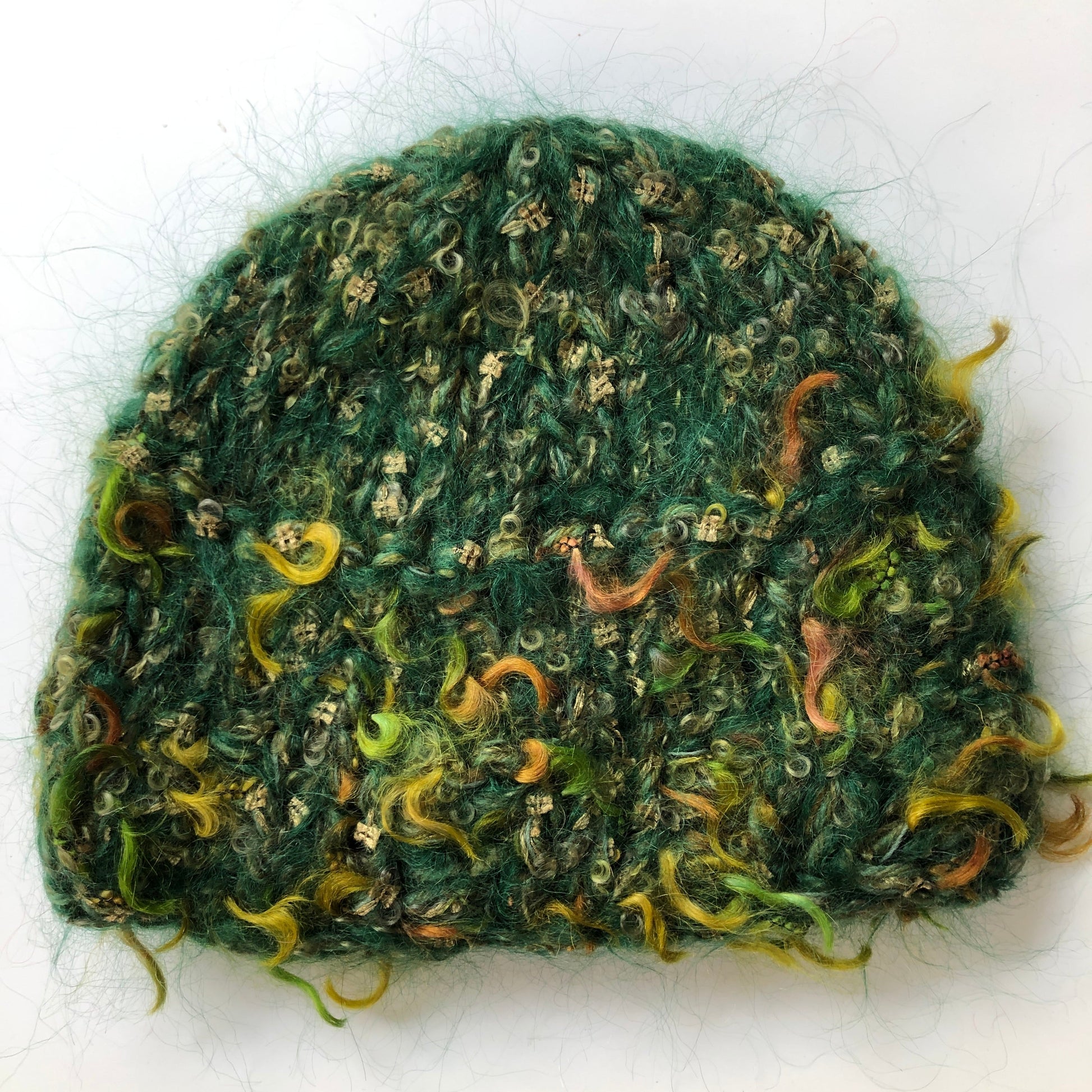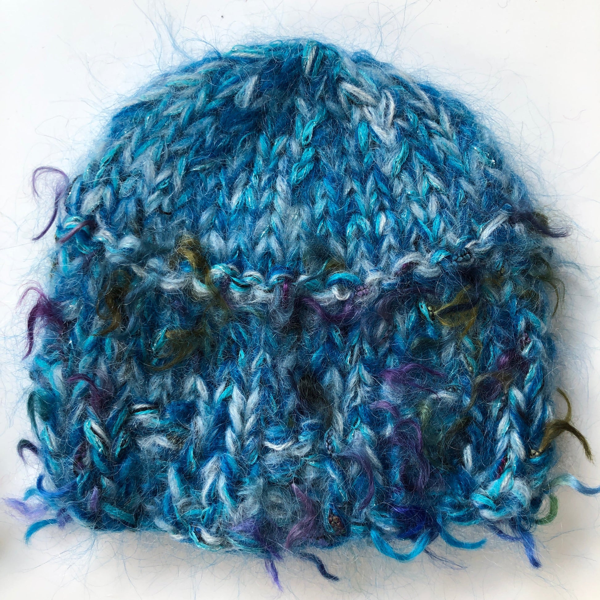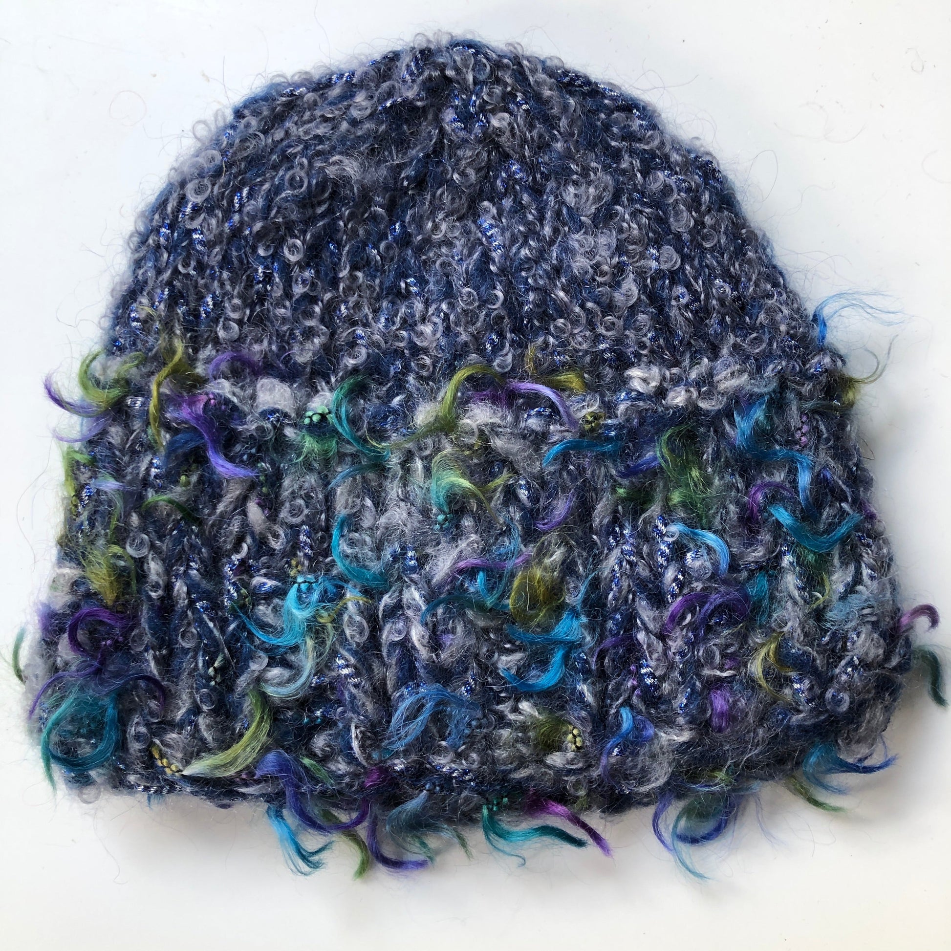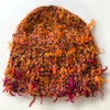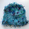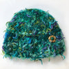 Warm and light, this shorter 'cloche' version of our multi strand cap is handknit from a mix of soft luxury fibres, primarily kid mohair and wool with some polyamide and lurex. To wash, soak in a mild shampoo, rinse, press in a towel and lay flat to dry. Vintage pin may vary. Approximately 7" or 18-20 cm in length.