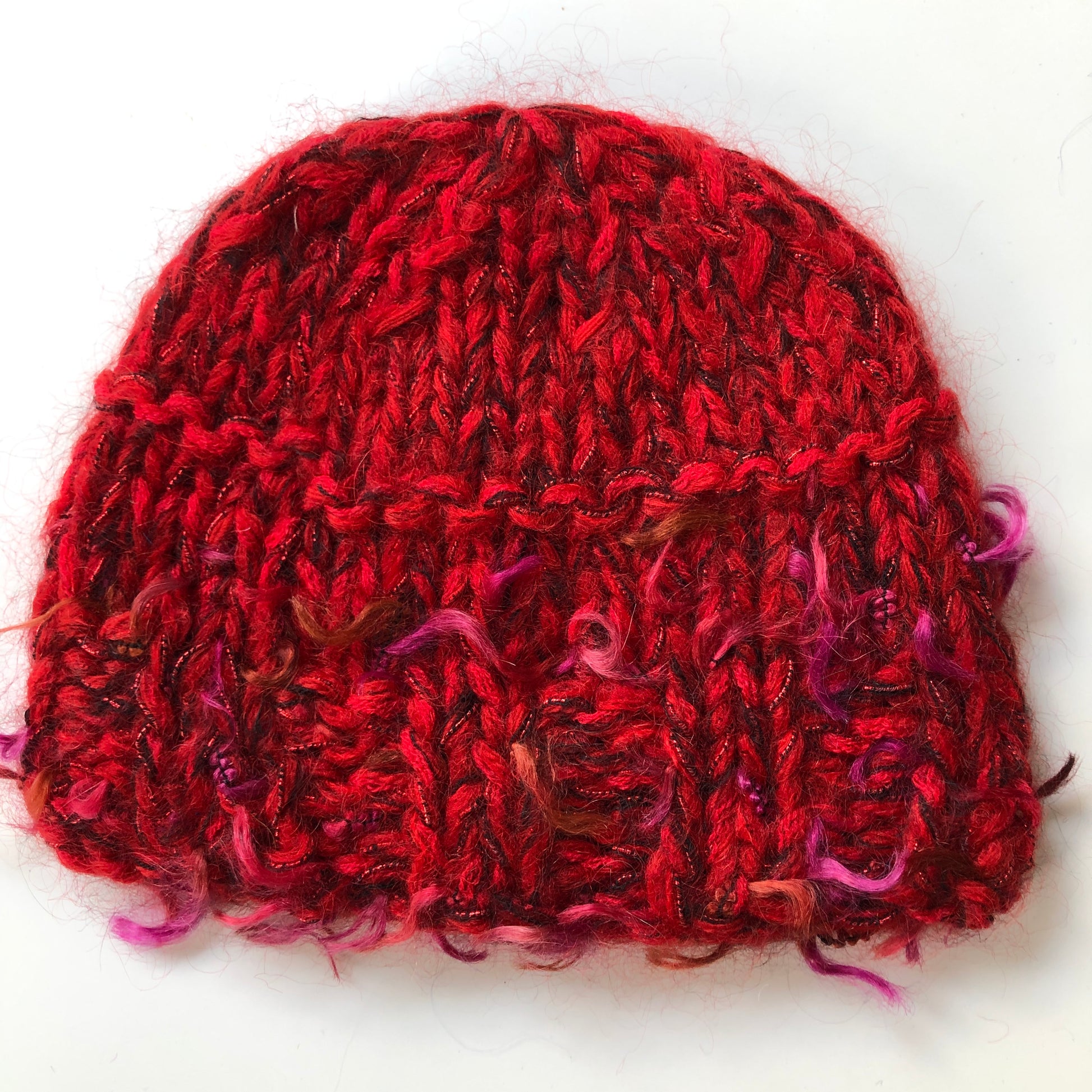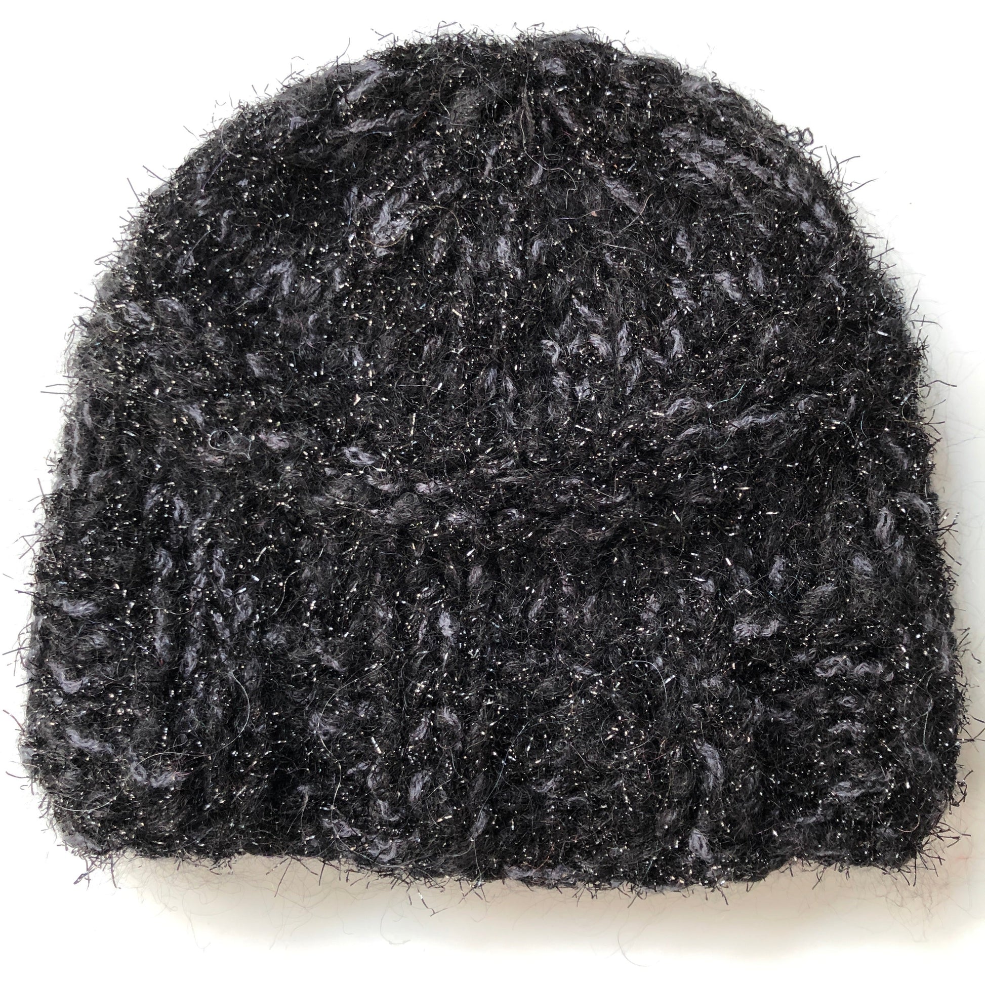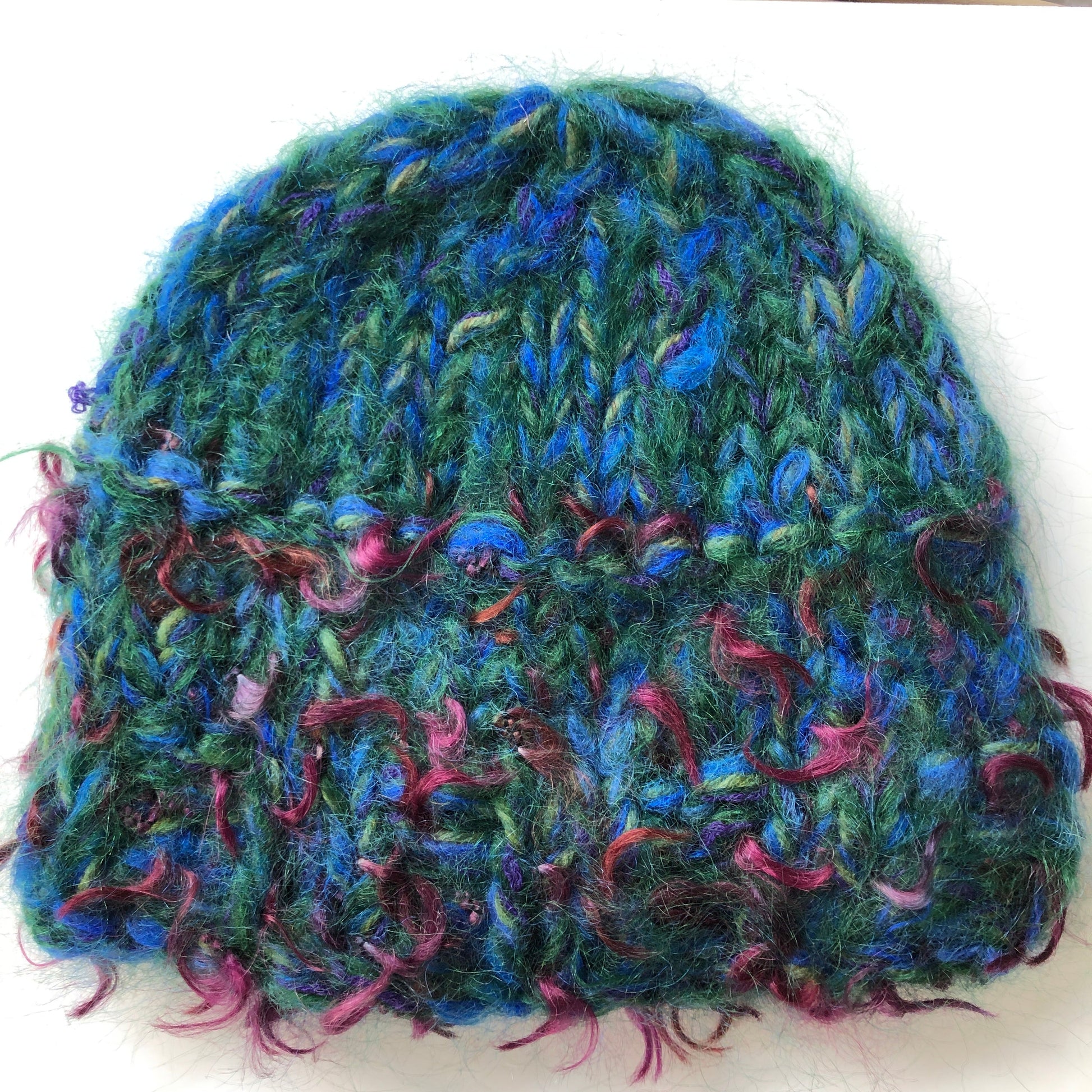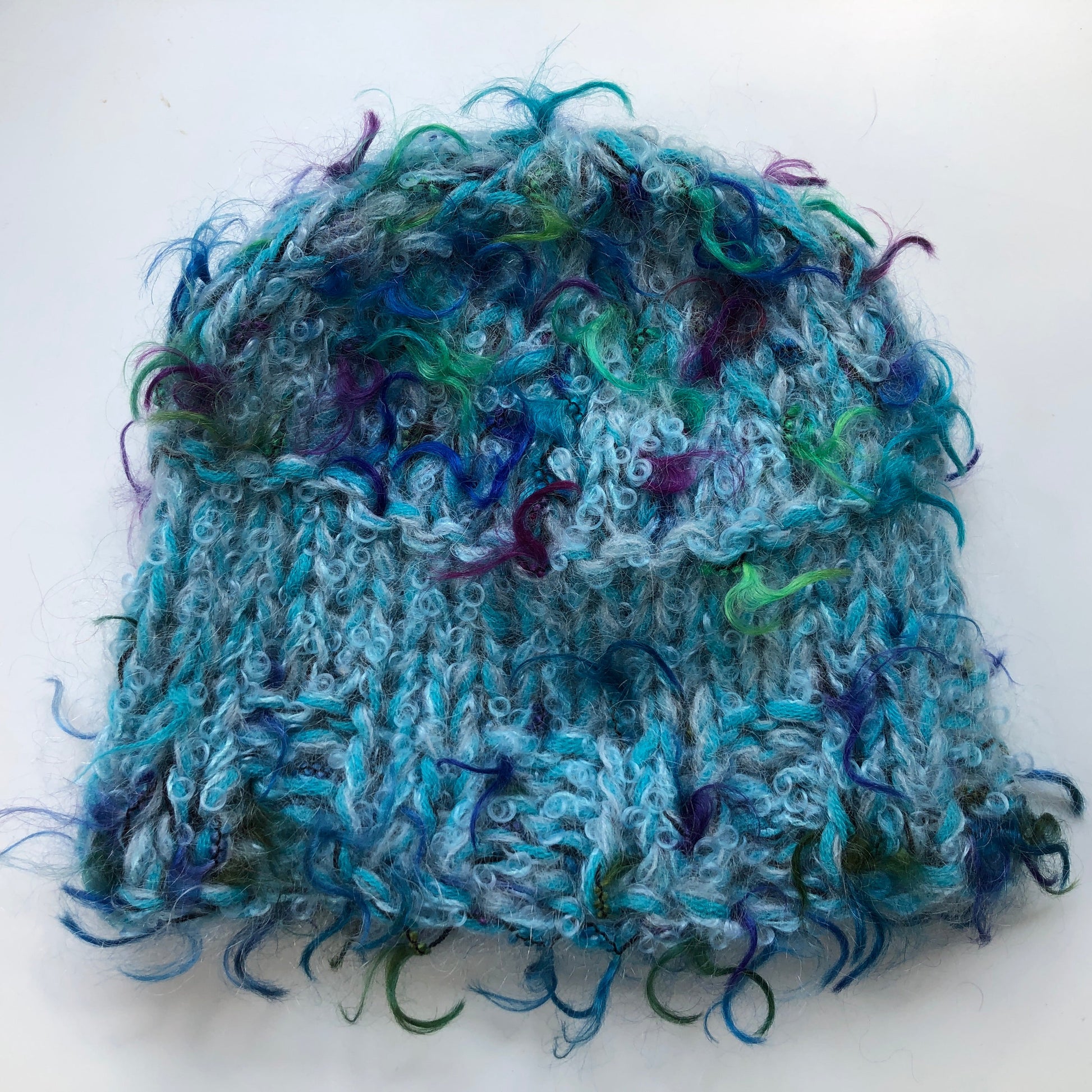 Warm and light, this shorter 'cloche' version of our multi strand cap is handknit from a mix of soft luxury fibres, primarily kid mohair and wool with some polyamide and lurex. To wash, soak in a mild shampoo, rinse, press in a towel and lay flat to dry. Vintage pin may vary. Approximately 7" or 18-20 cm in length.